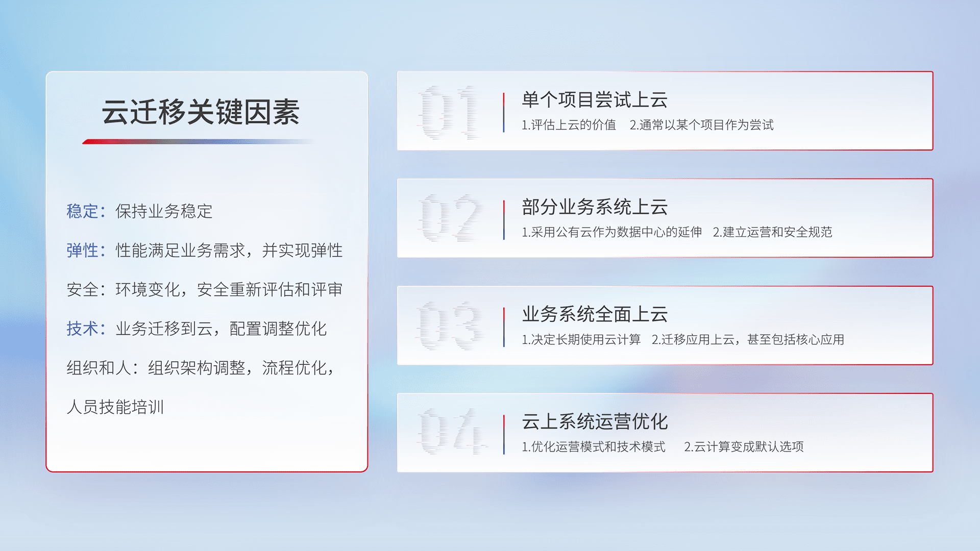 结合实际业务,,从规划设计、、云平台选型、、、、云原生改造、、数据迁移、、集成交付,,,迁移全过程为客户识别最佳上云路径,,做好风险识别管理,,,设计网络架构、、身份权限、、、、安全审计合规、、操作审计、、日志审计、、、监控告警策略、、多站点容灾设计等,,,对云上基础设施进行整体规划,,,提升IT治理水平,,,,以满足弹性、、、、高可用、、、、高性能的需求。。。