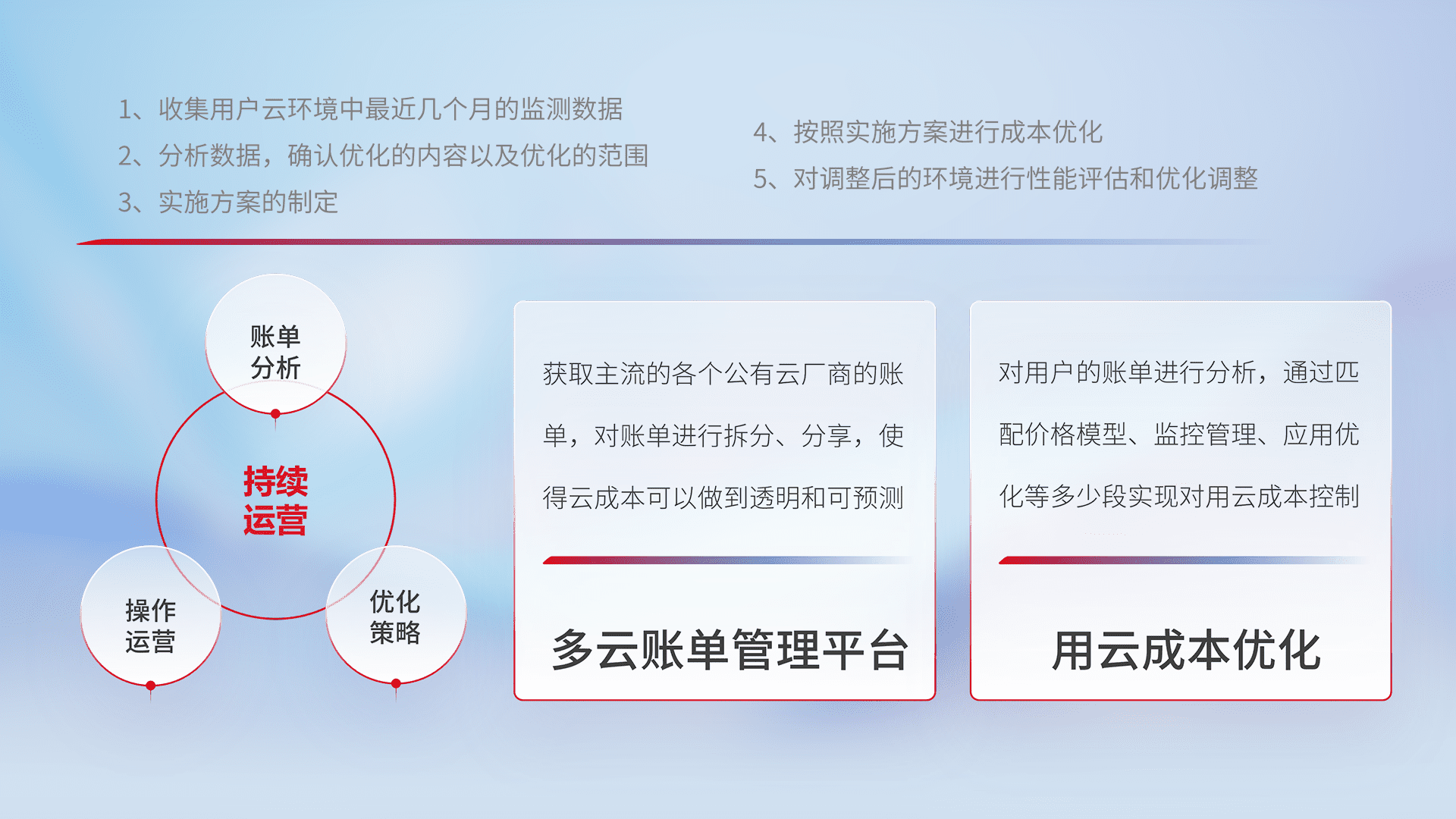 通过多云纳管,,以统一的资源数据模型把客户的云资源进行抽象和封装,,,,进而实现对多云资源的统一操作,,保障云资源管理的可靠性、、、、稳定性与可用性。。。量身定制化运维内容,,配置、、、、开发运维、、、、补丁管理、、备份、、、、监控、、、、认证和访问管理、、、、审计和日常巡检等,,,,保障在用云过程中的可靠度,,,,稳定度以及高可用率。。。。